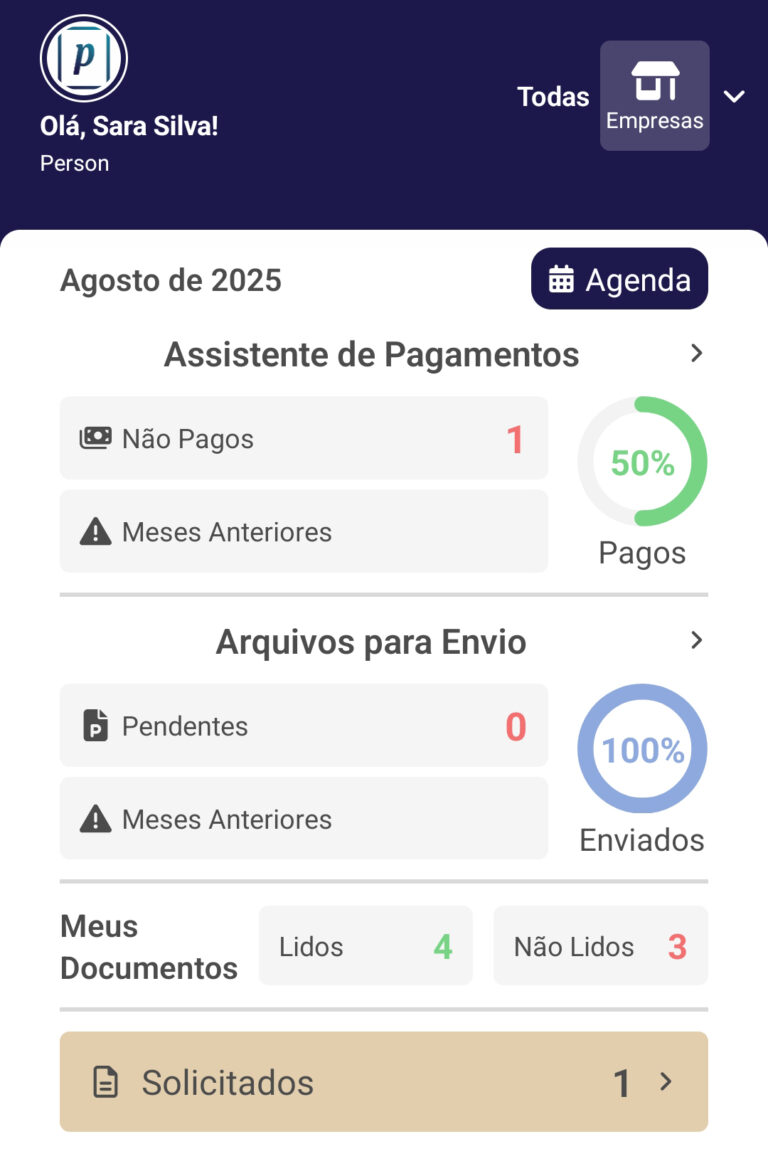 Conta PJ conectada ao sistema, com guias de tributos inseridas pela Person e registro automático de pagamentos para controle contábil.